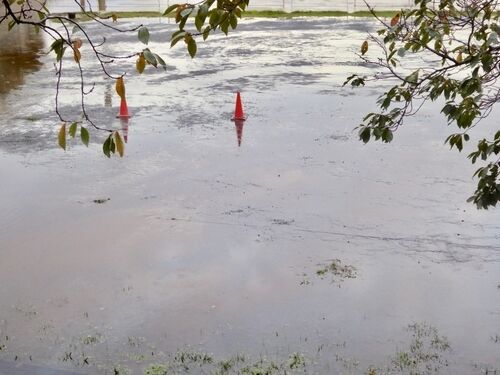 いつもはサッカーや野球をやっているグラウンド、水が湧いている。台風19号の影響だそうです。なかなか引かない。